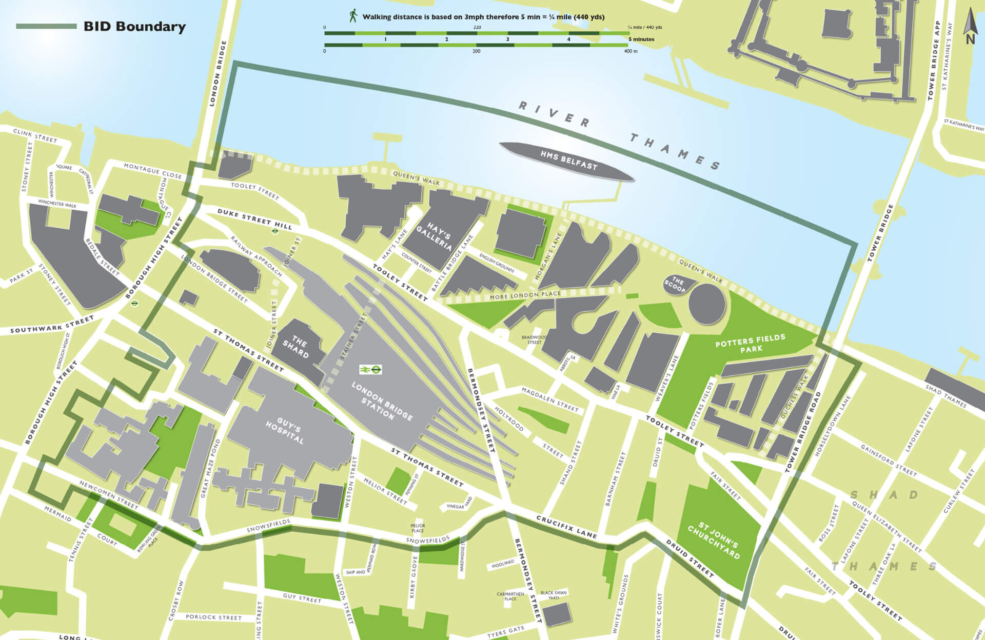 The London Bridge Business Improvement District (BID) stretches between London Bridge and just past Tower Bridge in the north to beyond Guy’s Hospital and the King’s College London campus in the south. It comprises the prominent business estates of London Bridge City and Shard Quarter, the 4th busiest rail station in the UK, Tower Bridge, a warship, and over 400 businesses. View the map below to see if your business falls within the Team London Bridge BID boundary.